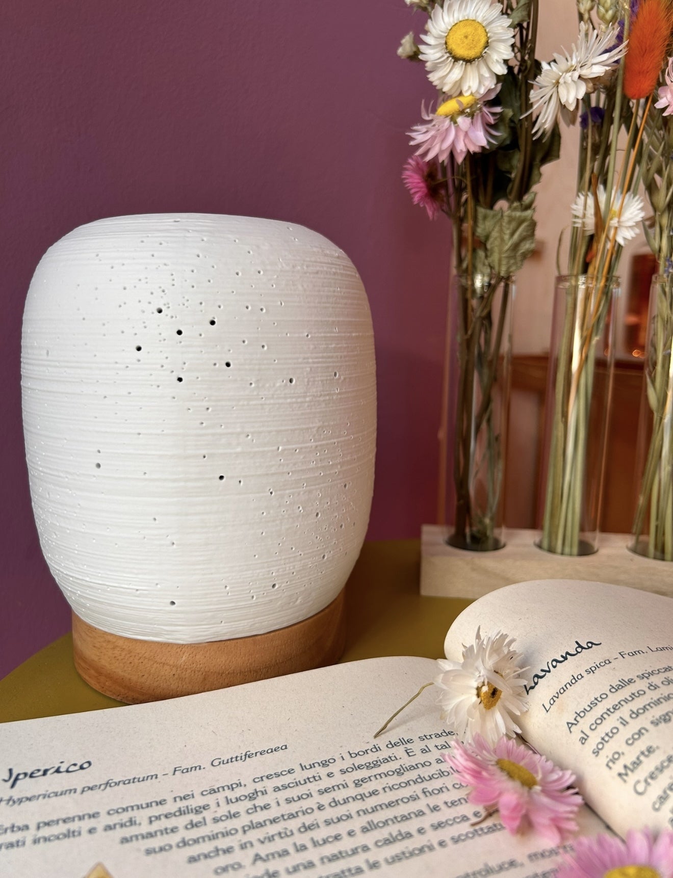 Basta qualche goccia del tuo olio essenziale preferito, e inizia il viaggio: la fragranza si diffonde nell’aria, avvolgendoti in un abbraccio invisibile fatto di calma, sogni e benessere.
